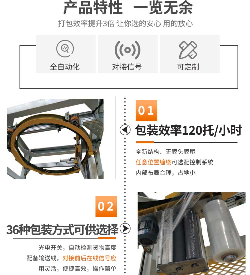 配有傳輸線 操作系統,高效簡單 多達36個包裝選項可供選擇 應用靈活,方便高效 光電開關檢測貨物高度 為企業節約包裝成本 包裝方式可任意選擇 允許薄膜防止薄膜松動 速度更快,使用更安全,故障率幾乎為零 環體采用獨特設計,使用壽命更長 自動送膜夾膜,自動焊膜,無膜尾 |