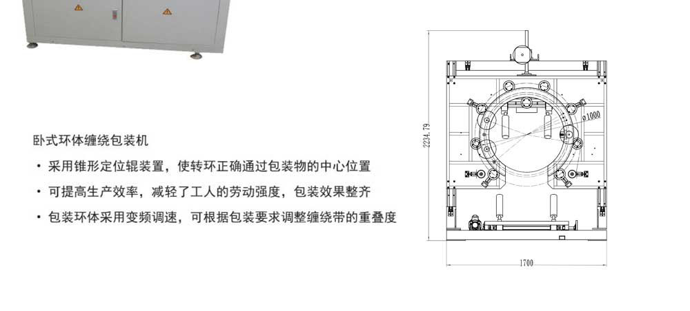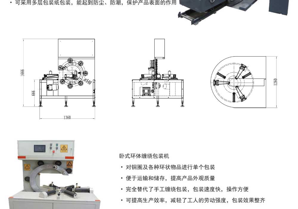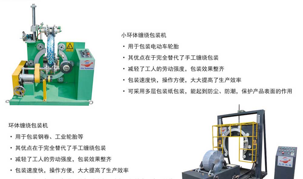 銅圈及各種環狀物品進行個體包裝,其優點在于完全替代了手工纏繞包裝,包裝速度快,操作方便,大大提高了生產效率,減輕了工人的勞動強度。包裝效果整齊,美觀,拉緊力強。起到防塵,防潮,保護設備表面的作用。便于運輸和儲存,提高設備外觀質量。