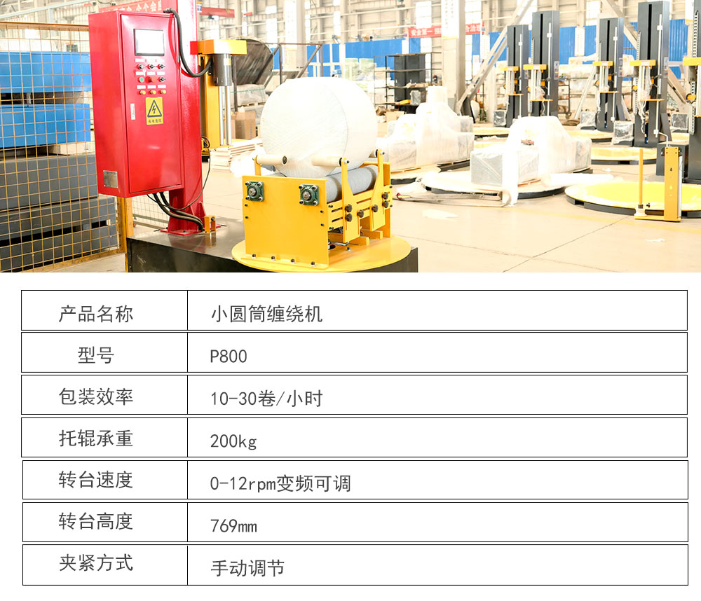 大宏佳森小圓筒纏繞機P800,圓筒類貨物全裹包設備主要適用于圓筒狀物體的軸向包裝,實現貨物360度的整體裹包。如無紡布、簾子布、線圈、橡膠制品及造紙(品)等的包裝。其特點:輕巧、靈便、操作簡便。同時可根據包裝的實際需要,選用自動頂出型、壓頂型、圓筒托盤兩用型、自動在線型等設備。