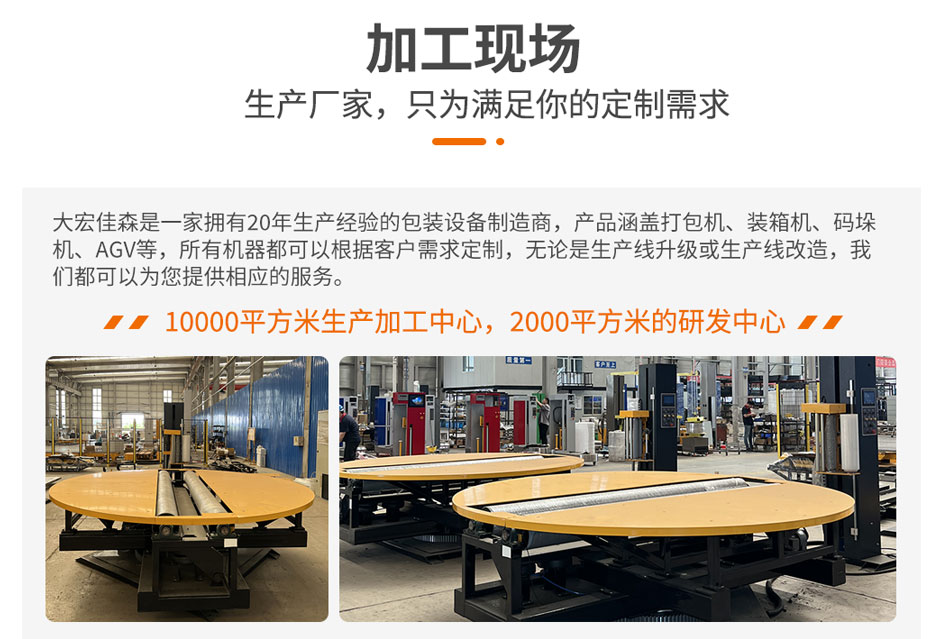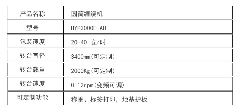 大宏佳森圓筒纏繞機HYP2000F-AU,包裝機采用PLC自動控制,性能可靠,可根據需要改變纏繞方式和次數;轉臺自動復位,保證貨物進出定位準確;用戶可選擇拉伸或預拉伸薄膜裝置;根據客戶需求,選配光電控制頭,自動測高;根據需要設計制造配套生產線。